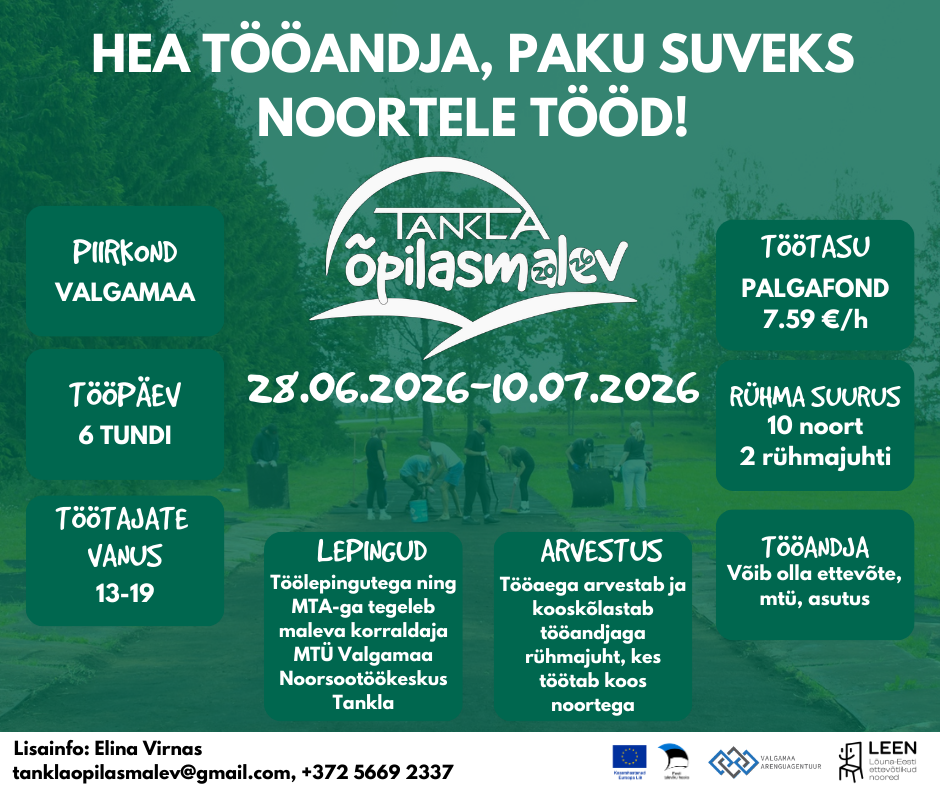 Tegevusi viiakse ellu meetme „Atraktiivne piirkondlik ettevõtlus- ja elukeskkond” vahenditest koostööprojekti "Lõuna-Eesti ettevõtlikud noored" (LEEN) raames. Kaasrahastab Euroopa Liit. Vaata lisaks www.ettevotlikudnoored.ee